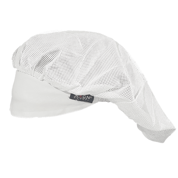 Σκούφος μάγειρα λευκός με γείσο και δίχτυ για συγκράτηση μαλλιών. Το βάρος του υφάσματος είναι 165gr. Σύνθεση: 65% πολυεστέρας – 35% βαμβάκι.
